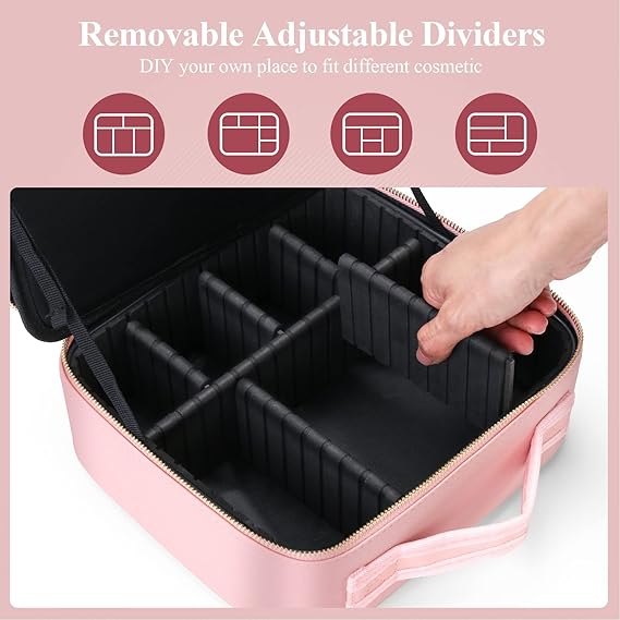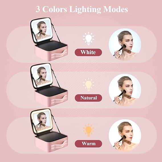 MocadoTravel Makeup Bag with LED Lighted Mirror, Travel Makeup Organizer, Makeup Case with 3 Color Lighted Setting and 10x Magnifying Mirror, Portable Storage and Adjustable Dividers Makeup Box(Pink)